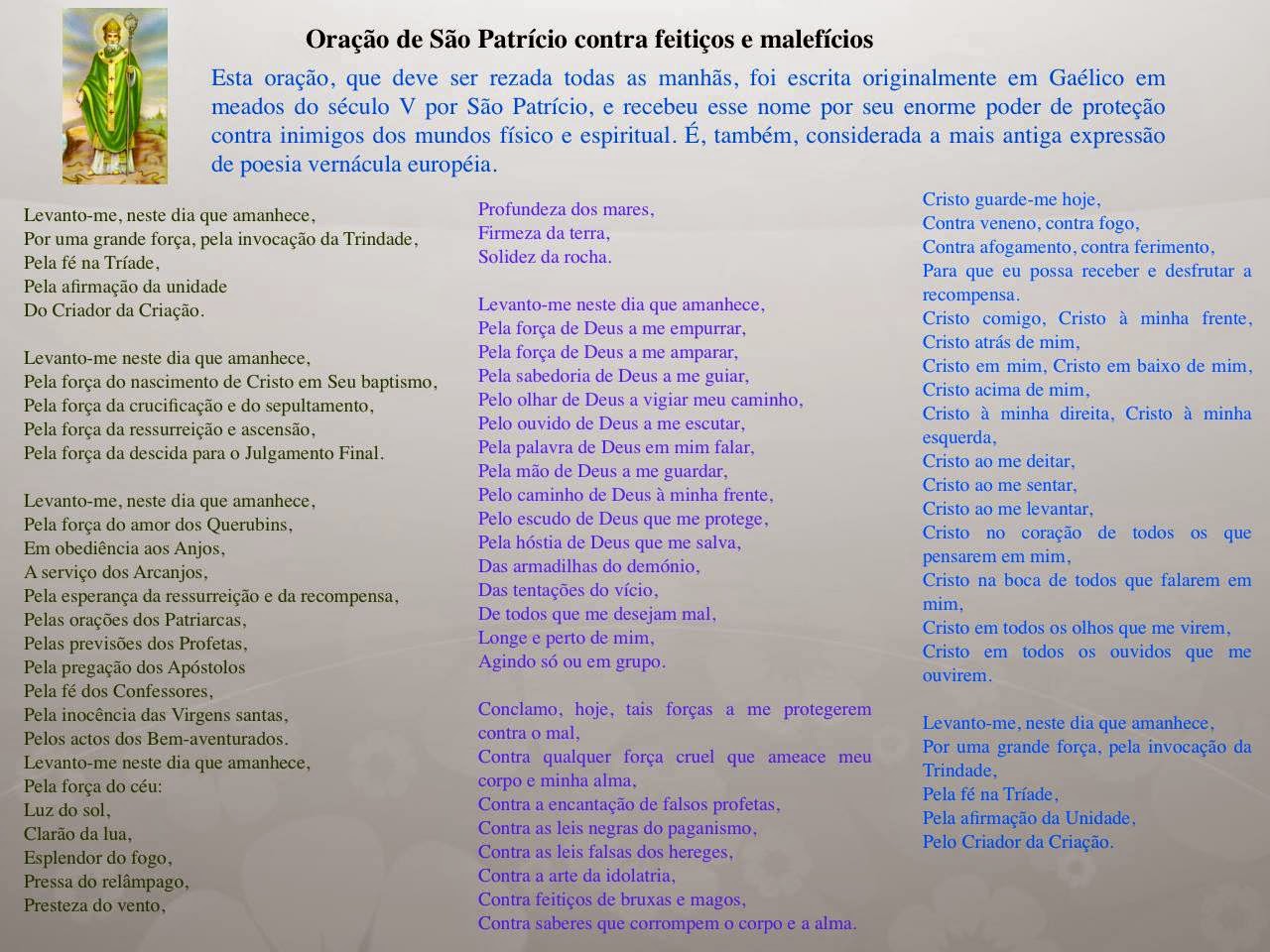 Oração de São Patrício. Hoje me levanto com poderosa força e invoco à Santíssima Trindade com trinitária fé professando a unidade do Criador e da criatura. Hoje me levanto com a força do nascimento de Cristo graças a seu batismo, com a força de sua crucificação e morte, com a força de sua ressurreição e ascensão, com a força.